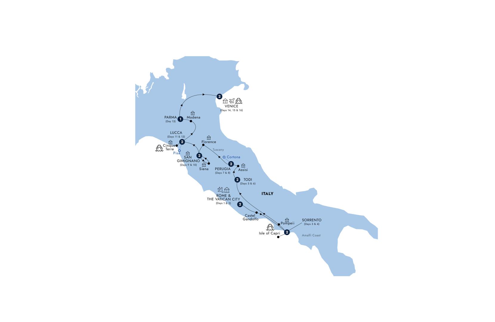 Journey to the ancient Roman city of Pompeii to explore this extraordinary site with your Local Expert. Travel into the heart of Italy to enjoy free time in Todi, located on a hilltop pedestal overlooking a vineyard-covered plain. Savor the distinctly medieval ambiance during your orientation and admire the Piazza del Popolo where locals take their evening 'passeggiata'. Cap off the day dining at a local restaurant with a glass of Orvieto Classico wine - a magical culinary experience.