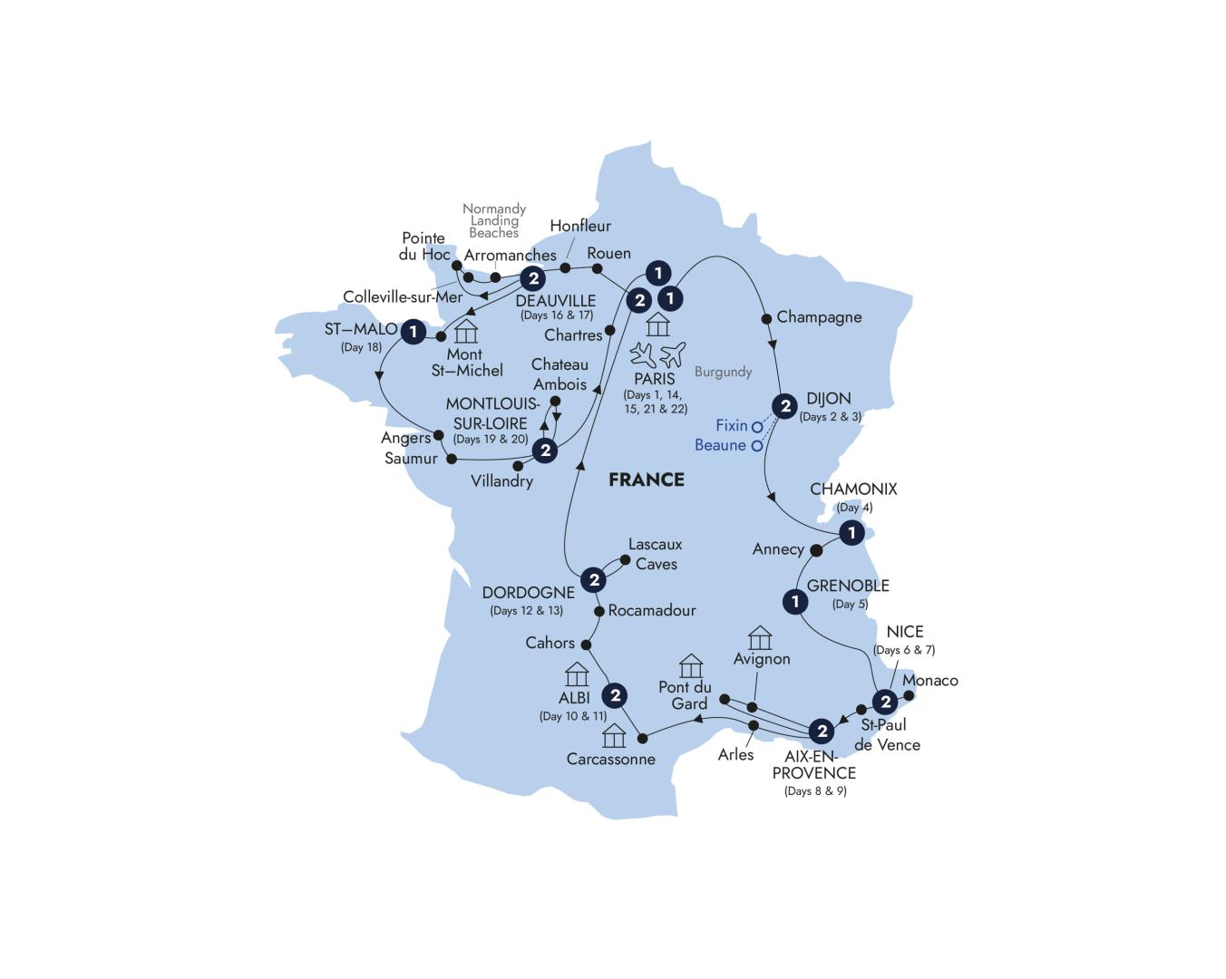 Take a once in a lifetime adventure across France, playing petanque in Provence, wine tasting in Chateau Le Luc, and jet-setting with the rich and famous on the French Riviera in Nice. This indulgent Tour de France showcases the famous bubbles of the Champagne region, the mustard making city of Dijon and the endless vineyards of Burgundy. The sights, tastes and tours are carefully curated at every stop across France starting in Paris, ensuring an authentic and immersive experience. From an ascent into the Alps to the fashionista ski resort of Chamonix to the stunning Mont St Michel abbey near Deauville, the itinerary doesn't miss a beat. In Saint-Malo, the City of the Corsairsnavigate the maze of medieval streets, humming with local markets and cubby hole cocktail bars.