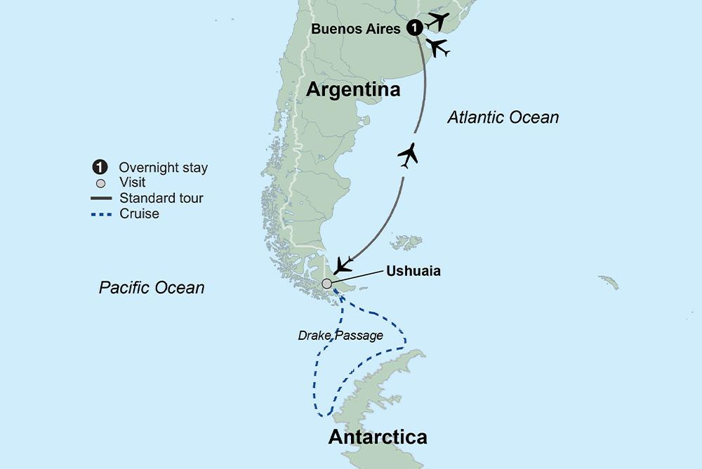 An overnight flight takes you to Buenos Aires, the launching point for your adventure into Antarctica.