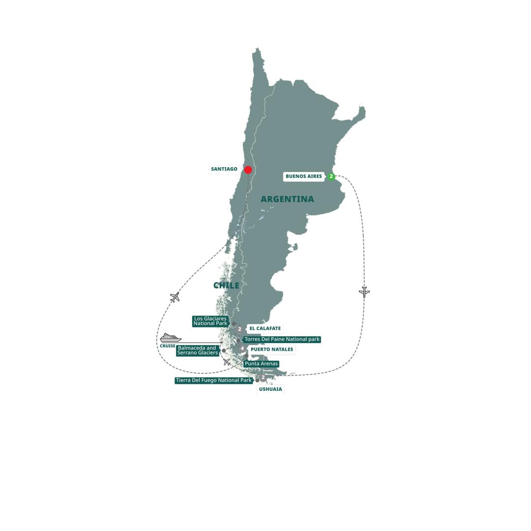 Depart this morning for the peninsula town of Punta Arenas to board your flight to Santiago International Airport, where your Patagonia adventure ends. Airport arrival will be at 8 p.m., please be aware when booking your onward flights.