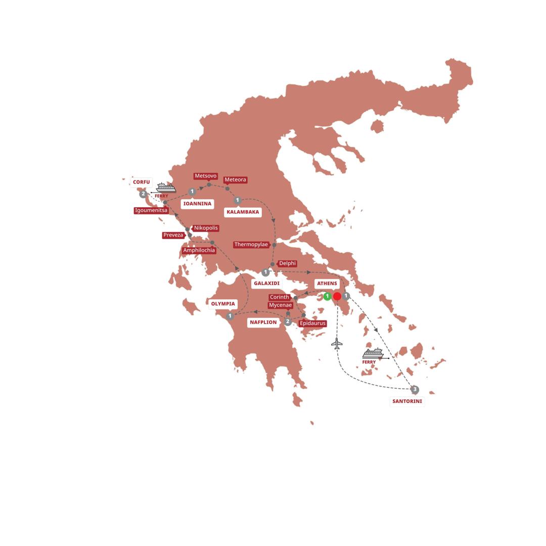 Leave the Peninsula and return to mainland Greece, continuing north past Amphilochia and Preveza, before arriving in Nikopolis to see where the Battle of Actium took place. Board a ferry and cross to the beautiful island of Corfu, where you'll have time at leisure to admire its splendid architecture, arcades and Spianada, one of the largest and most impressive squares in Greece.