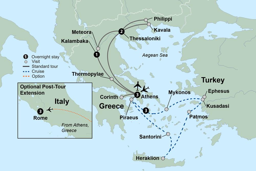 Marvel at the hanging monasteries of Meteora (UNESCO). These dark, sandstone pinnacles rise abruptly from the plain of Thessaly, with 6 historic monasteries perched upon their peaks. Beginning in the 10th century, hermits, monks, and ascetics sought solitude and spiritual solace in these dramatic crags. Visit two amazing Meteora monasteries*** which are renowned for their intricate construction and exquisite Byzantine art. Your day ends in Thessaloniki, Greece's second largest city. Founded in 315 B.C., Thessaloniki was an early center for Christianity. Paul visited and preached here during the winters of A.D. 49-50 and wrote 2 epistles to the ancient Thessalonians.