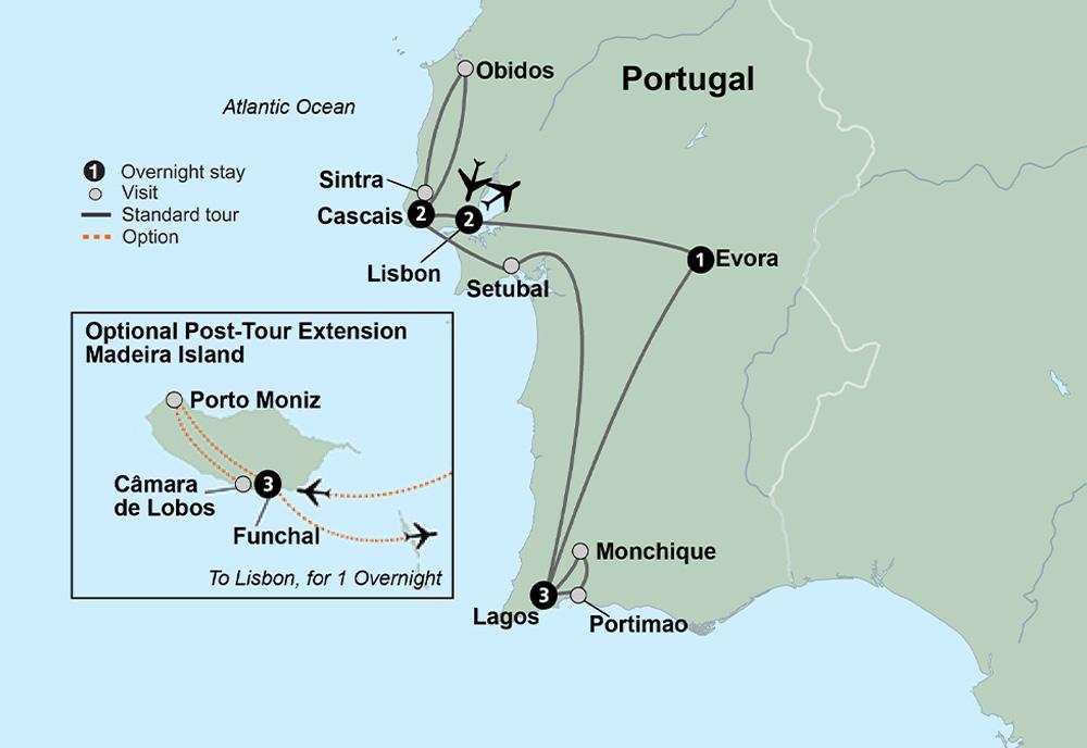 Explore the picture-perfect city of Obidos, where white-washed houses sit snug within medieval city walls, and toast with a ginjinha, a sour cherry liqueur served in a small chocolate cup. Continue on to Sintra (UNESCO), a breathtaking hub that served as the summer residence of Portuguese kings for six centuries. Then, it's your choice! Explore the quaint hilltop village of Sintra and take some time to wander through the winding streets -OR- join a guided tour of the National Palace of Sintra, considered the best-preserved medieval palace in Portugal. Bid Portugal goodbye during dinner in Cascais and celebrate the end of your unforgettable journey.