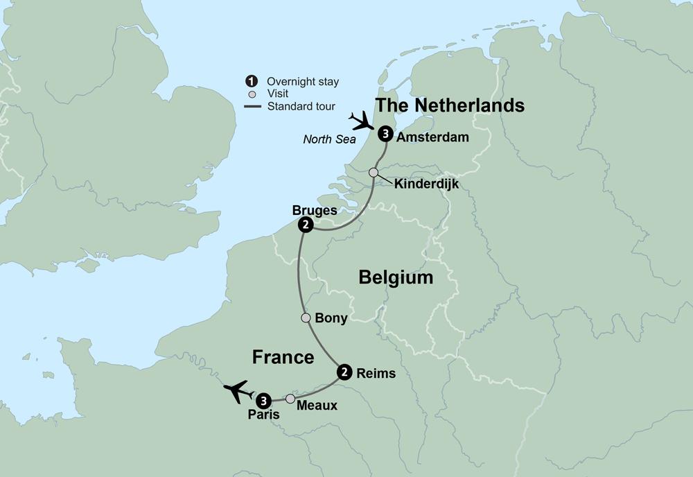 From iconic Dutch windmills and cozy Belgian streets to the world-renowned Champagne region and the "City of Light," experience the essence of three European countries. Connect with deeply rooted cultures as you make your way through the Netherlands, Belgium, and France.