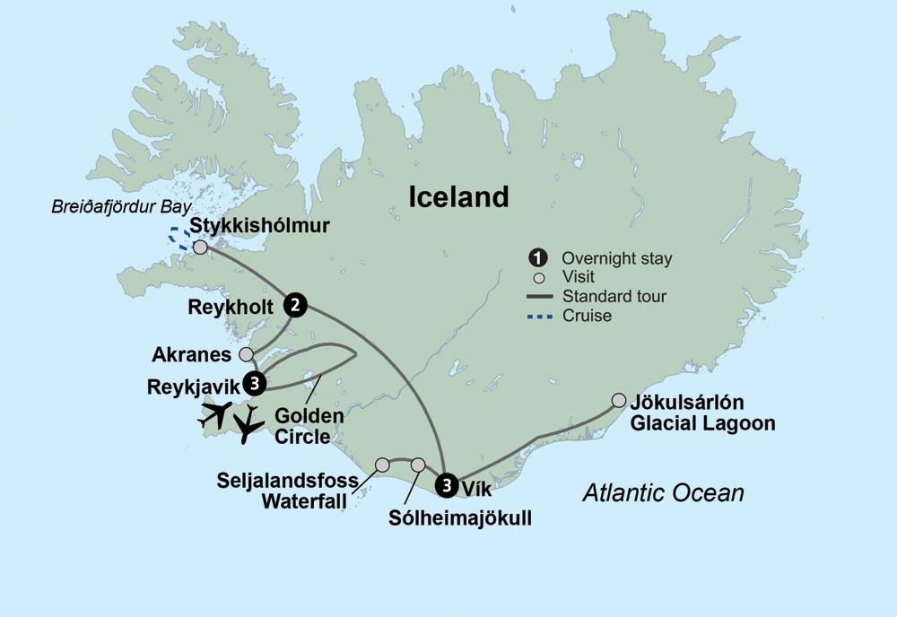 Drive along the scenic south shore to the Skogar Museum. Discover its turf-built houses and its collection of farm and domestic artifacts. Nearby, find the impressive Skogafoss waterfall, one of the tallest in Iceland. Behold Reynisfjara, a black volcanic sand beach scattered with caves and surrounded by basalt columns and cliffs. The beach is rich with bird life, such as the fulmar, black guillemot, razorbill, and gannet. You might also spot some nesting puffins*** along the unique natural rock formations at Dyrholaey, a volcanic peninsula towering over the ocean. Cap off your day with a visit to Solheimajokull Glacier, part of Iceland's fourth largest ice cap. Take in its dramatic, blue-white ice, rugged crevasses, and stunning views.