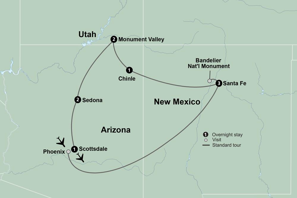 Delve into the spirit of America's Southwest, where striking desert landscapes are interwoven with the rich cultures and histories of Indigenous peoples. Arrive in New Mexico, the "Land of Enchantment," and begin your journey in Santa Fe the multicultural state capital. With arrival times varying, there are no scheduled activities today. If time allows, you might acquaint yourself with this historically layered city, shaped by Indigenous, Spanish, Mexican, and other influences.